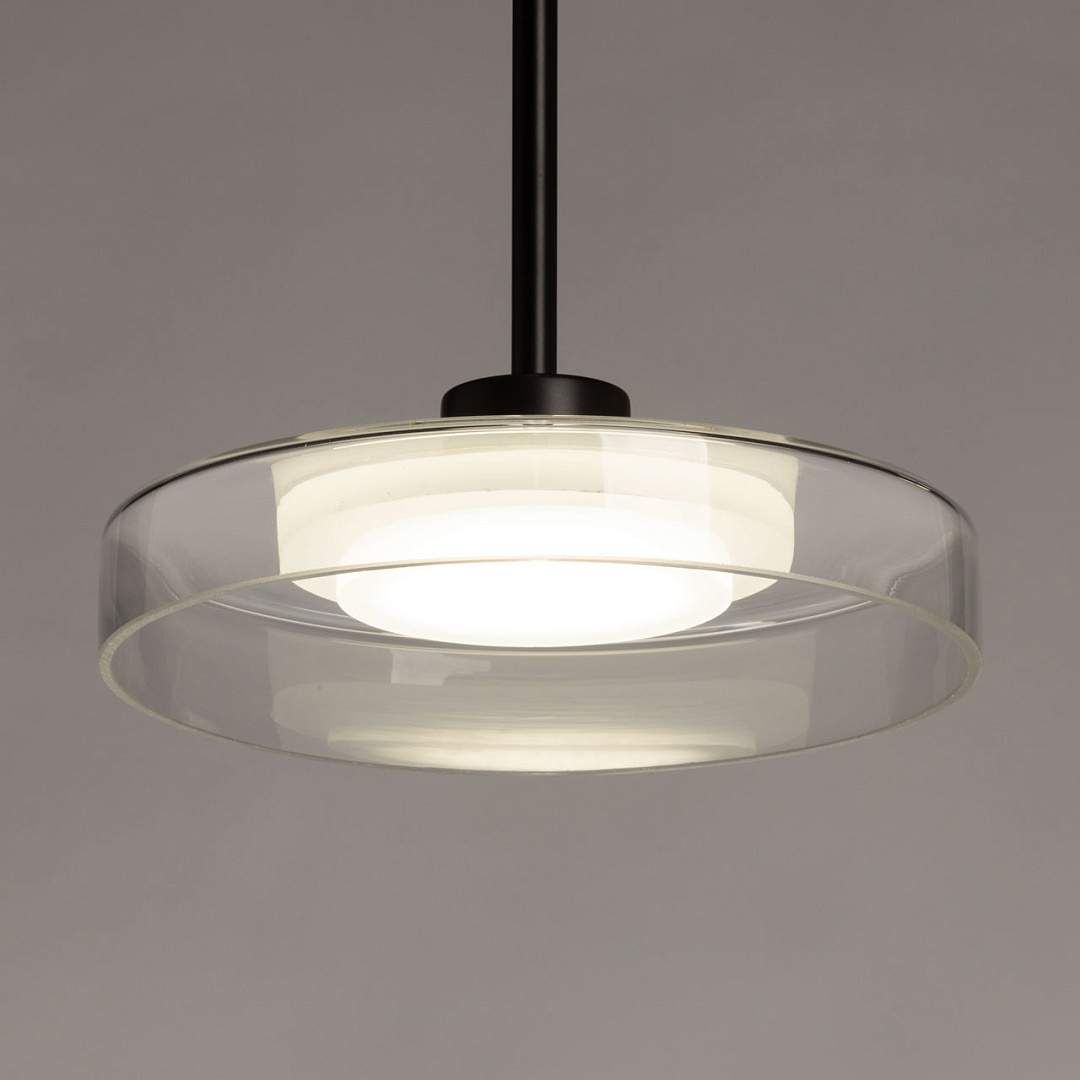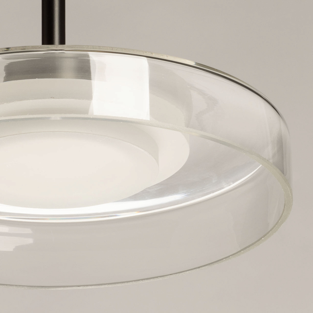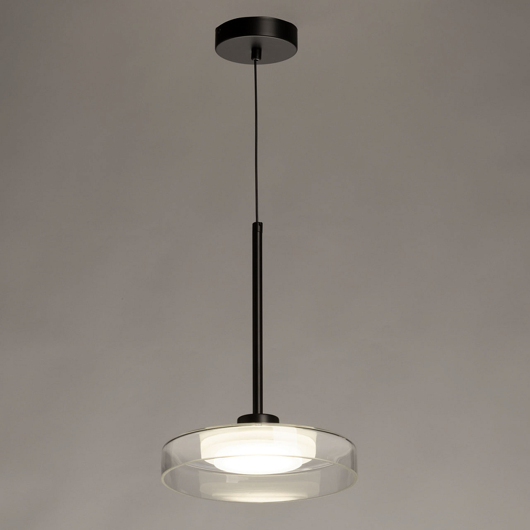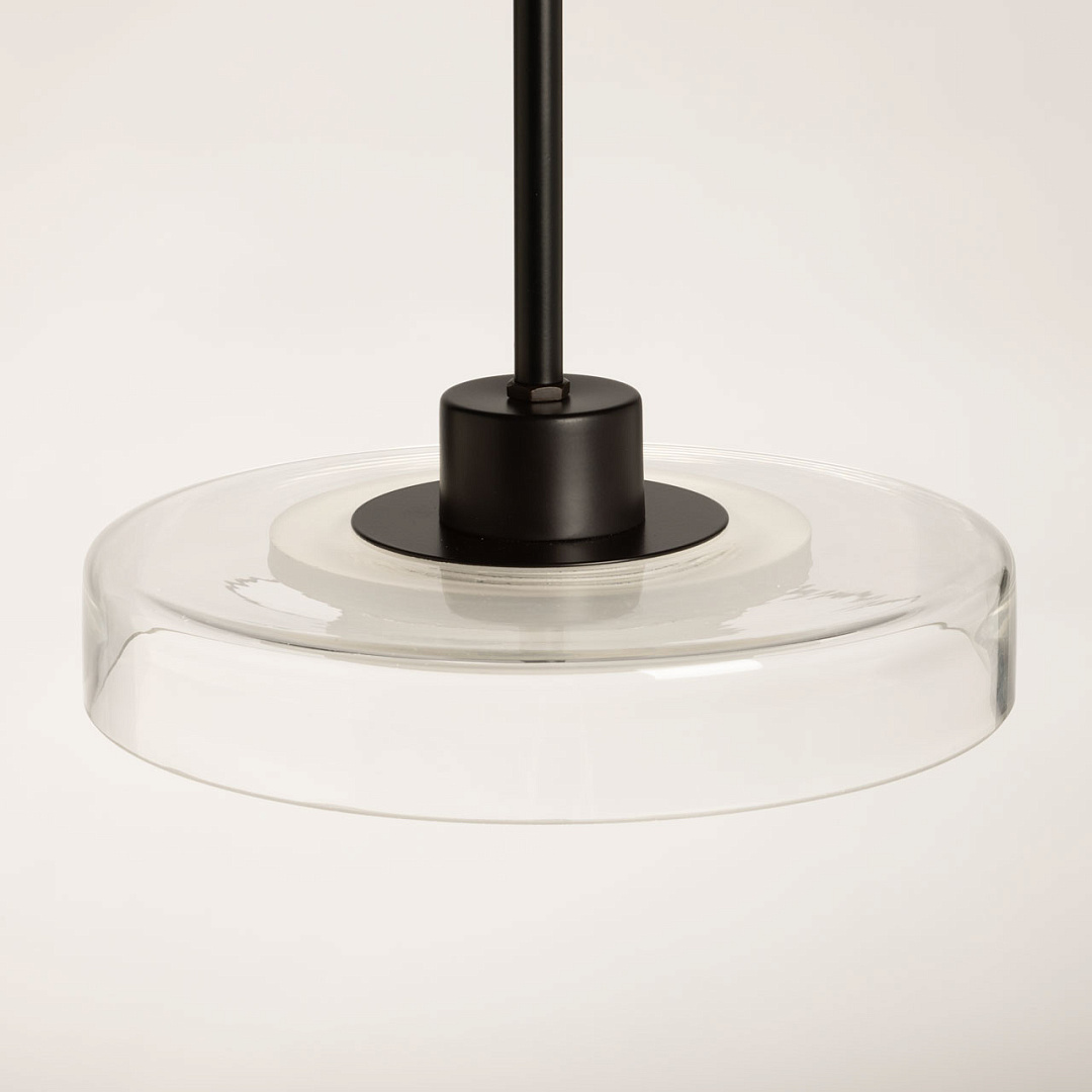 Черный цвет основания создает сдержанный и стильный образ. Стеклянный прозрачный плафон придает люстре элегантности. Светодиодный источник света закрыт матовым акрилом, создавая равномерное и комфортное освещение. Качественные светодиоды экономичны и безопасны. Возможность регулировать комфортную высоту.