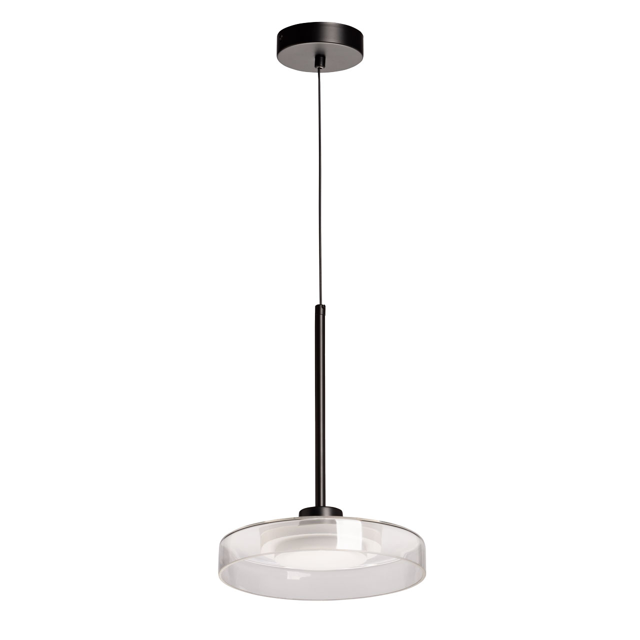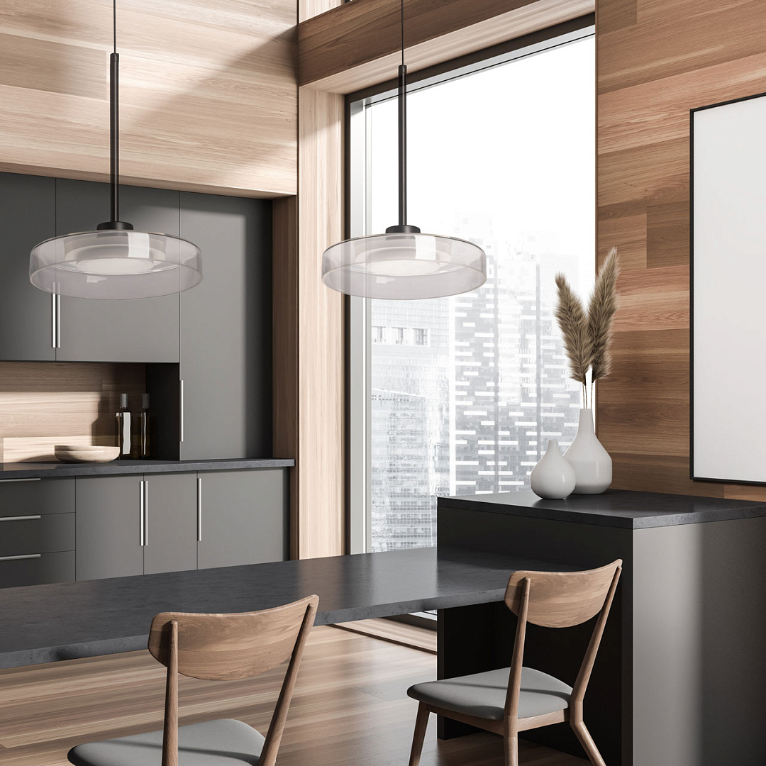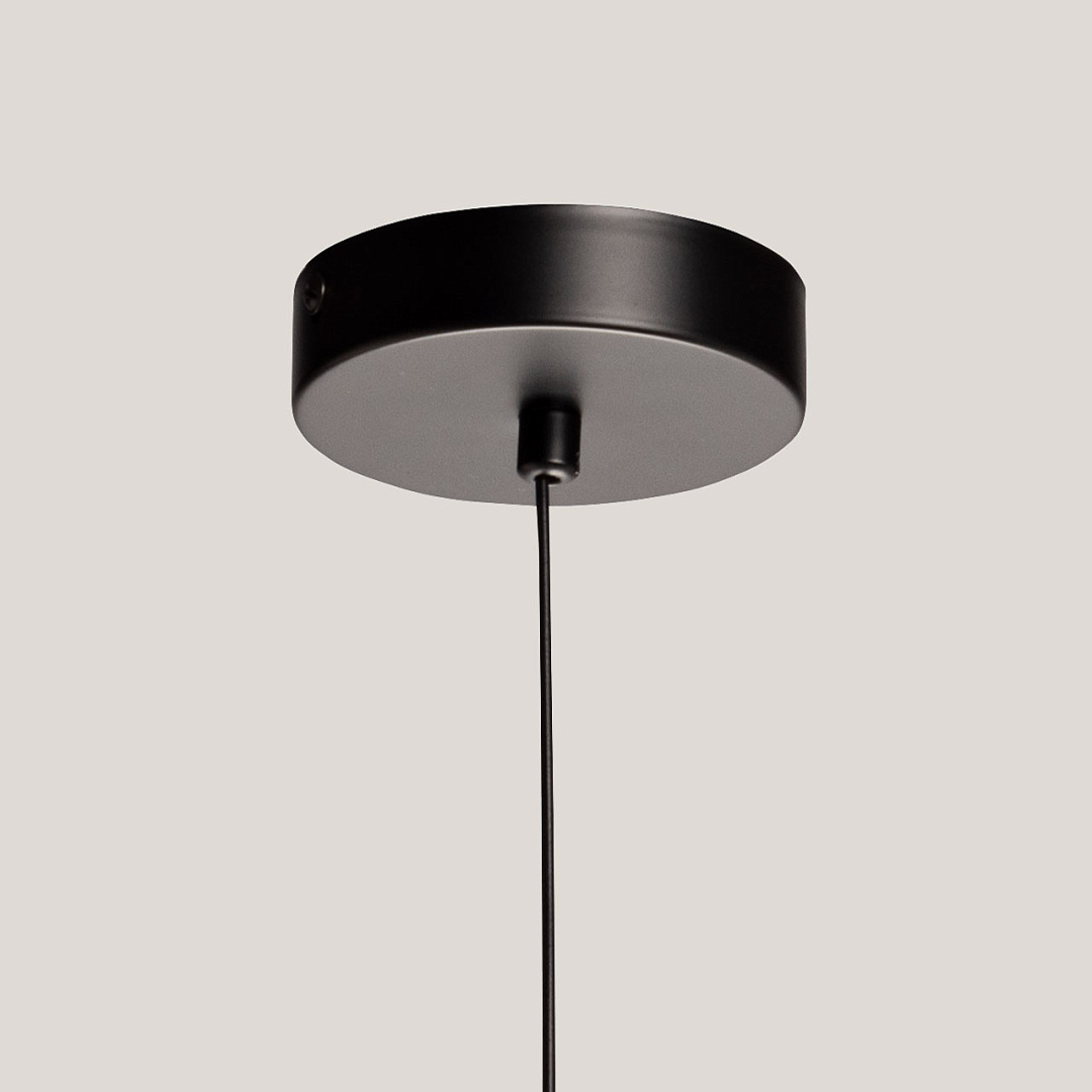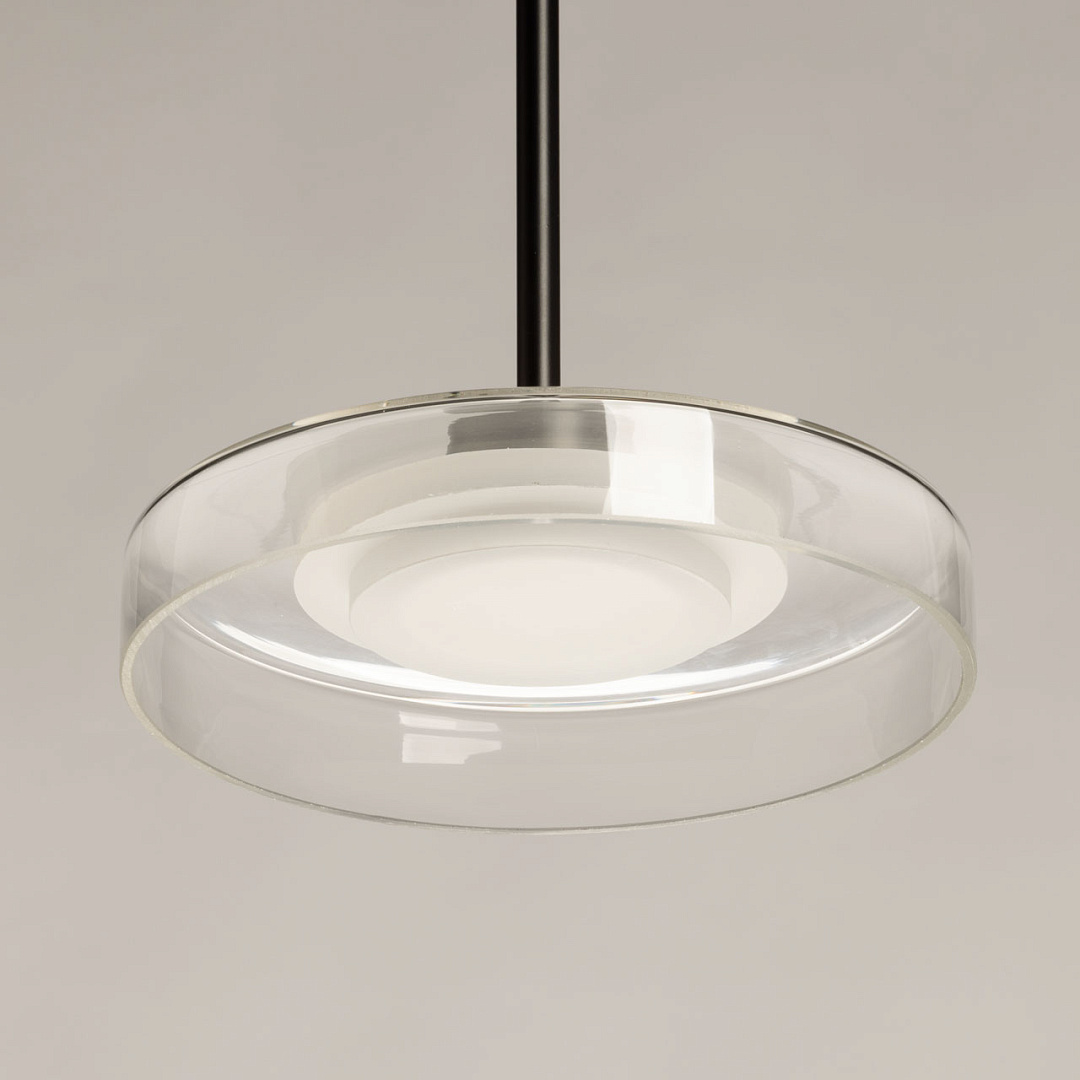 Черный цвет основания создает сдержанный и стильный образ. Стеклянный прозрачный плафон придает люстре элегантности. Светодиодный источник света закрыт матовым акрилом, создавая равномерное и комфортное освещение. Качественные светодиоды экономичны и безопасны. Возможность регулировать комфортную высоту.