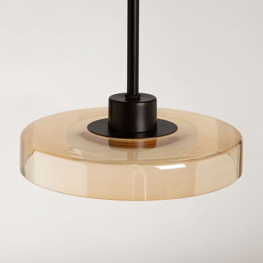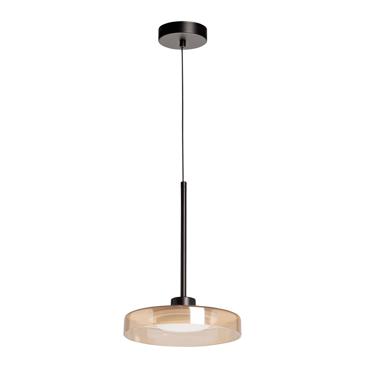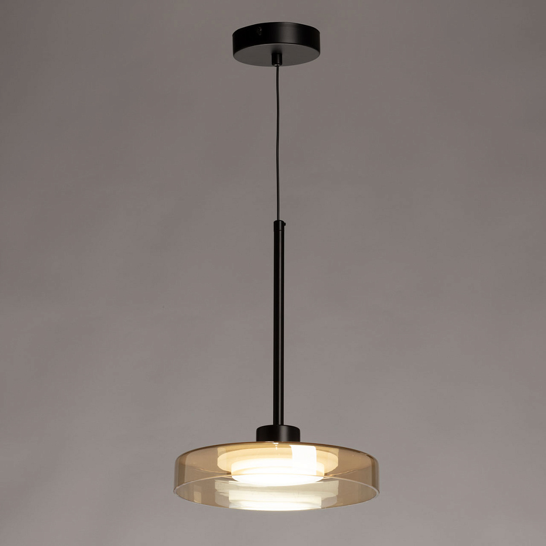 Черный цвет основания создает сдержанный и стильный образ. Стеклянный плафон цвета шампань придаёт люстре элегантности. Светодиодный источник света закрыт матовым акрилом, создавая равномерное и комфортное освещение. Качественные светодиоды экономичны и безопасны. Возможность регулировать комфортную высоту.