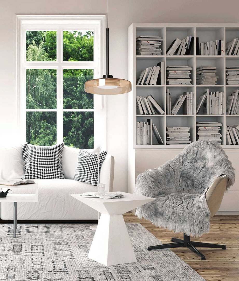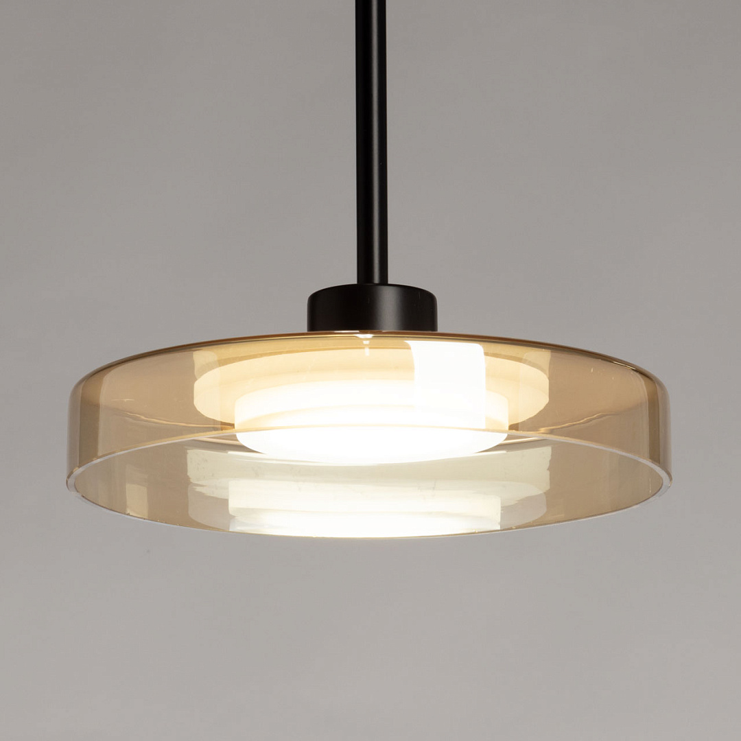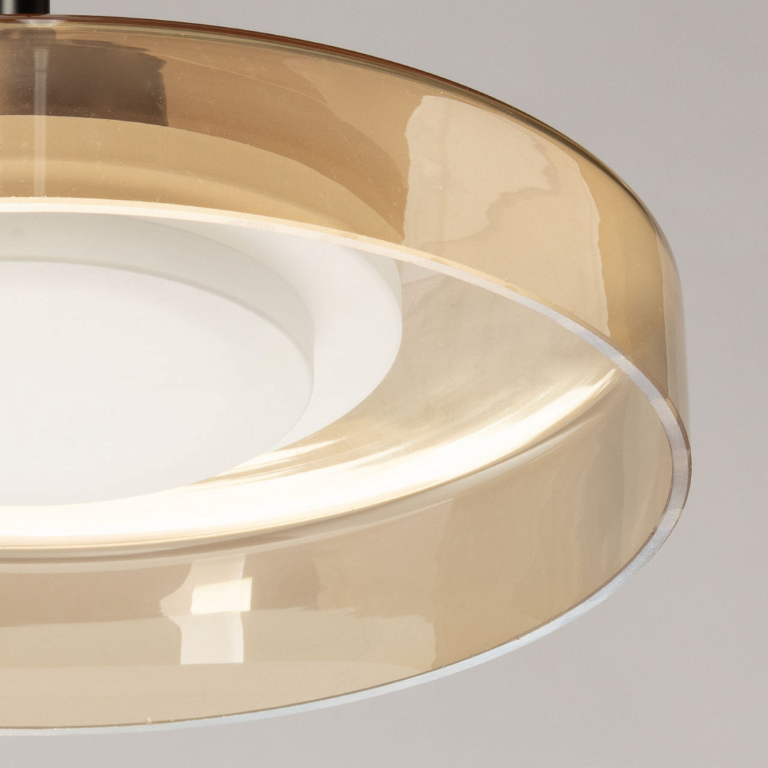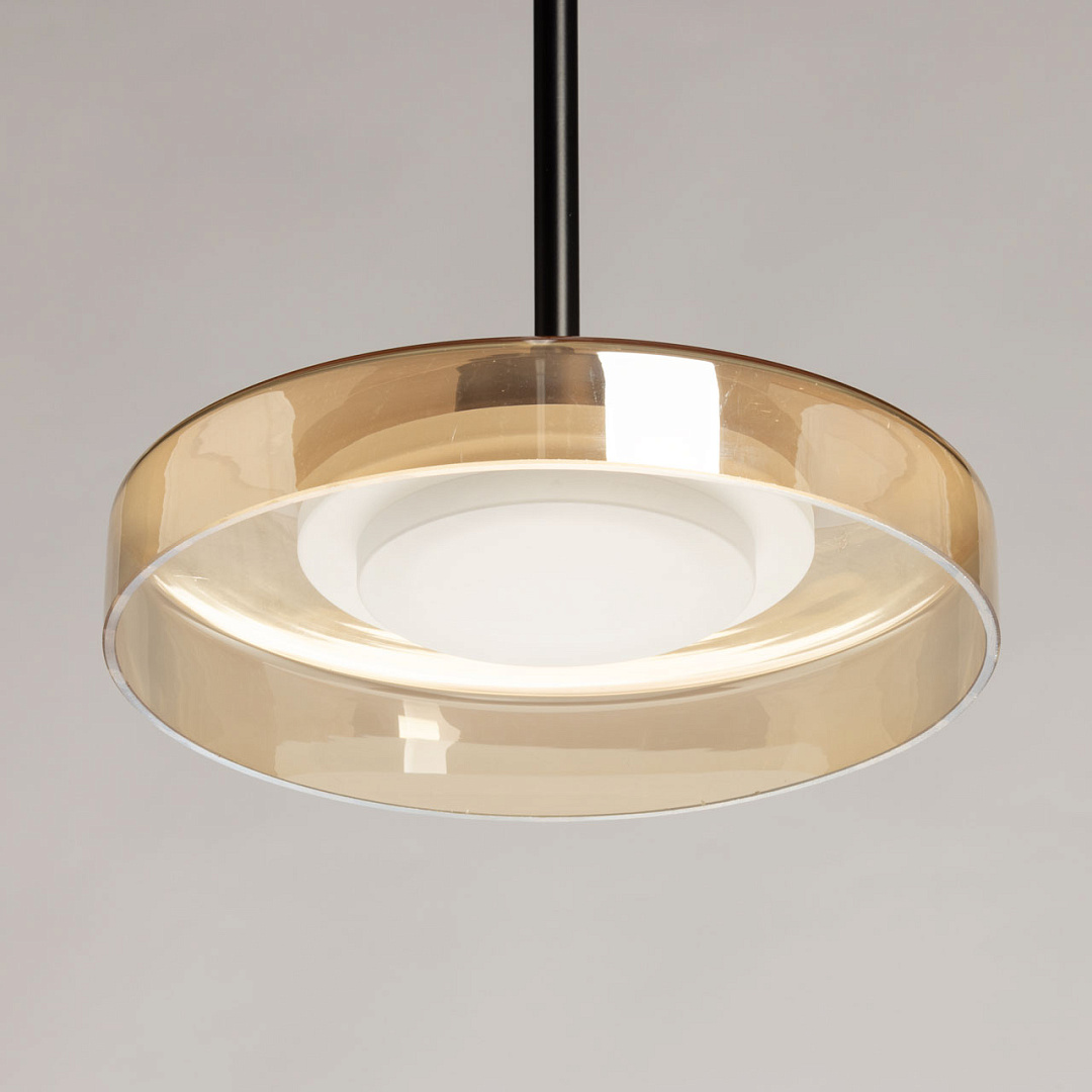 Черный цвет основания создает сдержанный и стильный образ. Стеклянный плафон цвета шампань придаёт люстре элегантности. Светодиодный источник света закрыт матовым акрилом, создавая равномерное и комфортное освещение. Качественные светодиоды экономичны и безопасны. Возможность регулировать комфортную высоту.