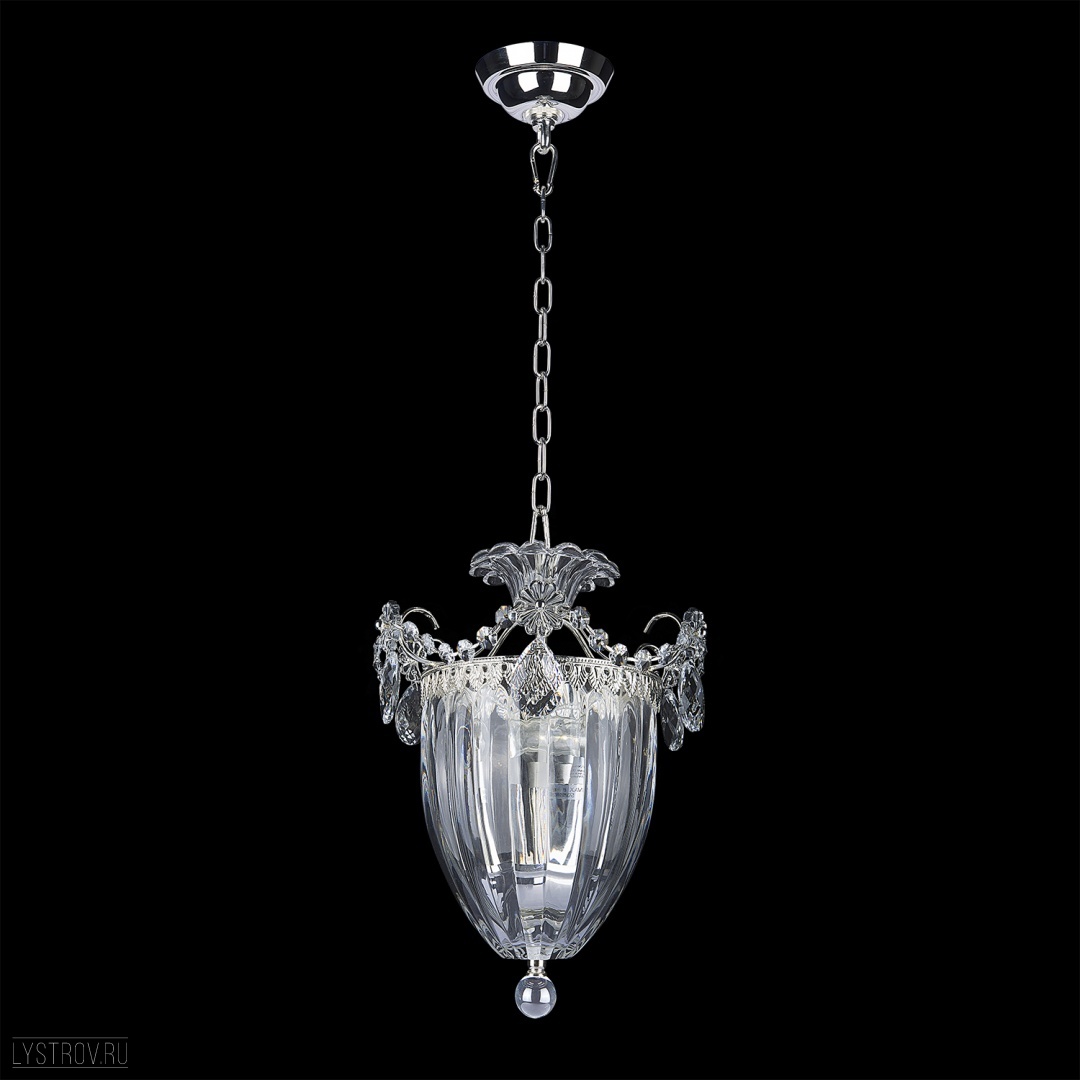 металла серебристого цвета. Поверхность арматуры глянцевая. Плафон изготовлен из стекла прозрачного цвета, имеет сложную форму и прозрачную поверхность. Направлен вниз. Декоративные элементы выполнены из прозрачного хрусталя. Осветительный прибор рассчитан на освещение пространства площадью 9 кв. м. Тип цоколя используемых ламп E14. Производитель рекомендует использовать лампы мощностью не более 60 Вт. Суммарная мощность светильника составляет 180 Вт. Лампочки в комплект не входят. Защита от попадания влаги и пыли внутрь изделия не предусмотрена. Рекомендуем к применению в гостиной, кабинете, прихожей, спальне.