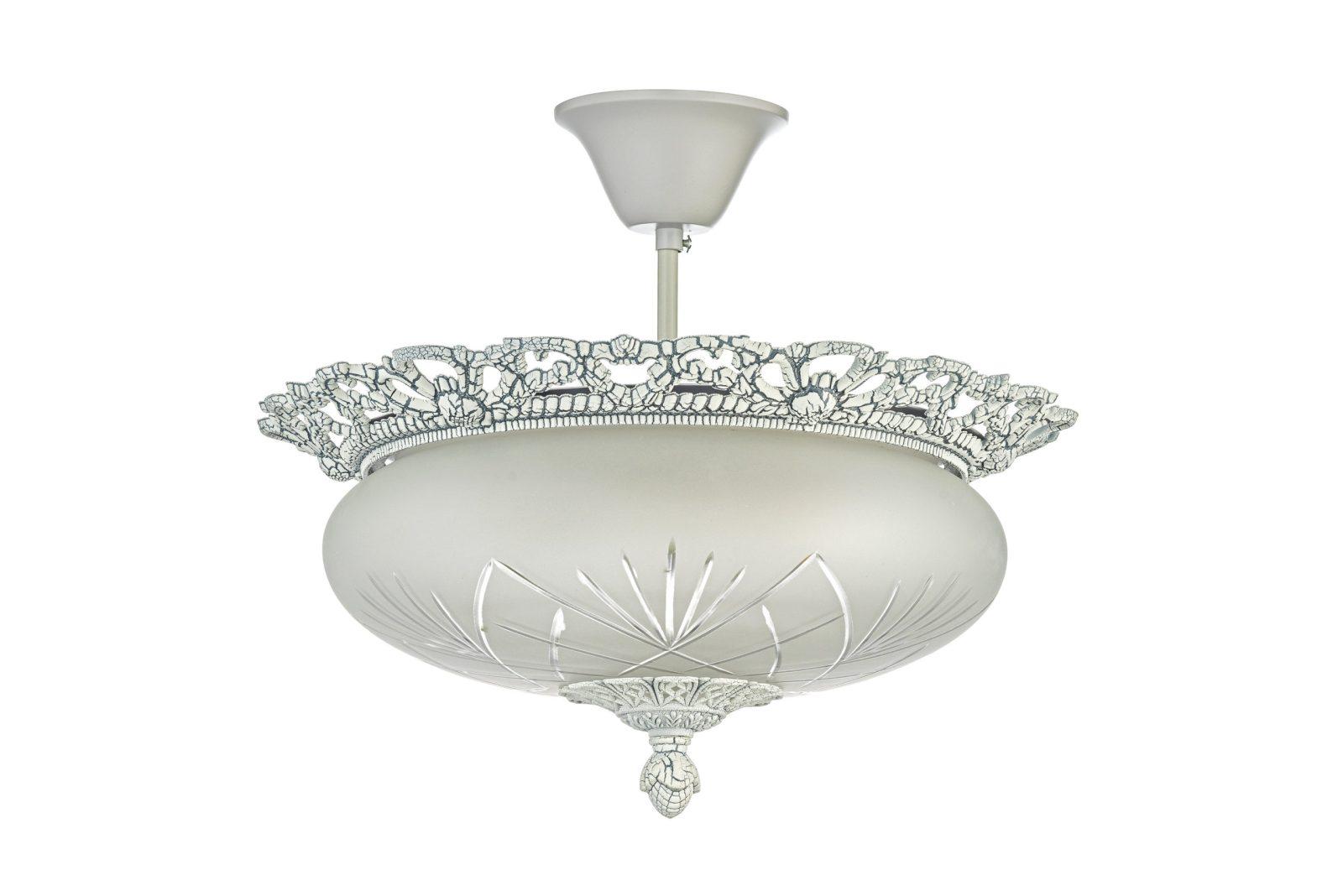 металла белого состаренного цвета. Поверхность арматуры матовая. Плафон изготовлен из матового стекла белого цвета, имеет круглую выпуклую форму и рельефную поверхность. Направлен вниз. Осветительный прибор рассчитан на освещение пространства площадью 9 кв. м. Тип цоколя используемых ламп E27. Производитель рекомендует использовать лампы мощностью не более 60 Вт. Суммарная мощность светильника составляет 180 Вт. Лампочки в комплект не входят. Защита от попадания влаги и пыли внутрь изделия не предусмотрена. Рекомендуем к применению в гостиной, кабинете, прихожей, спальне.