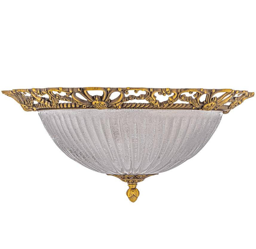 металла цвета античное золото. Поверхность арматуры матовая, рельефная. Плафон изготовлен из матового стекла белого цвета, имеет форму полусферы и рельефную поверхность. Направлен вниз. Осветительный прибор рассчитан на освещение пространства площадью 15 кв. м. Тип цоколя используемых ламп E27. Производитель рекомендует использовать лампы мощностью не более 60 Вт. Суммарная мощность светильника составляет 300 Вт. Лампочки в комплект не входят. Защита от попадания влаги и пыли внутрь изделия не предусмотрена. Рекомендуем к применению в гостиной, кабинете, прихожей, спальне.