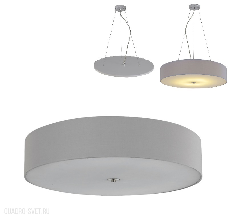 металла цвета хром. Поверхность арматуры глянцевая. Плафон изготовлен из текстиля и пластика белого и серого цветов. Осветительный прибор рассчитан на освещение пространства площадью 18 кв. м. Тип цоколя используемых ламп E27. Производитель рекомендует использовать лампы мощностью не более 60 Вт. Суммарная мощность светильника составляет 360 Вт. Лампочки в комплект не входят. Защита от попадания влаги и пыли внутрь изделия не предусмотрена. Рекомендуем к применению в гостиной, спальне, прихожей, кабинете.