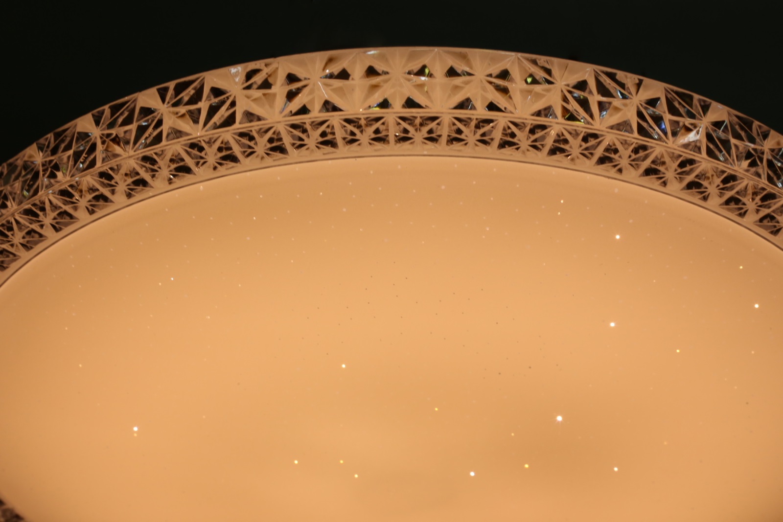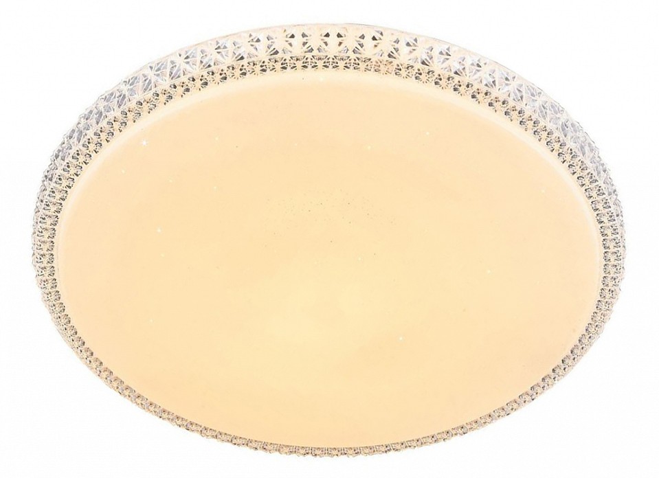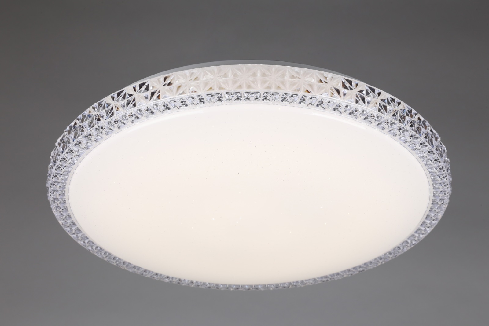 металла белого цвета. Поверхность арматуры матовая. Плафон изготовлен из полимера белого и прозрачного цветов, имеет круглую плоскую форму и матовую поверхность. Направлен вниз. Осветительный прибор рассчитан на освещение пространства площадью 14 кв. м. Тип цоколя используемых ламп LED. Производитель рекомендует использовать лампы мощностью не более 30 Вт. Суммарная мощность светильника составляет 30 Вт. Лампочки входят в комплект. Защита от попадания влаги и пыли внутрь изделия не предусмотрена. Имеется пульт ДУ. Цвет свечения изменяется от теплого к холодному (3000K-6400K). Рекомендуем к применению в гостиной, кабинете, прихожей, спальне.
