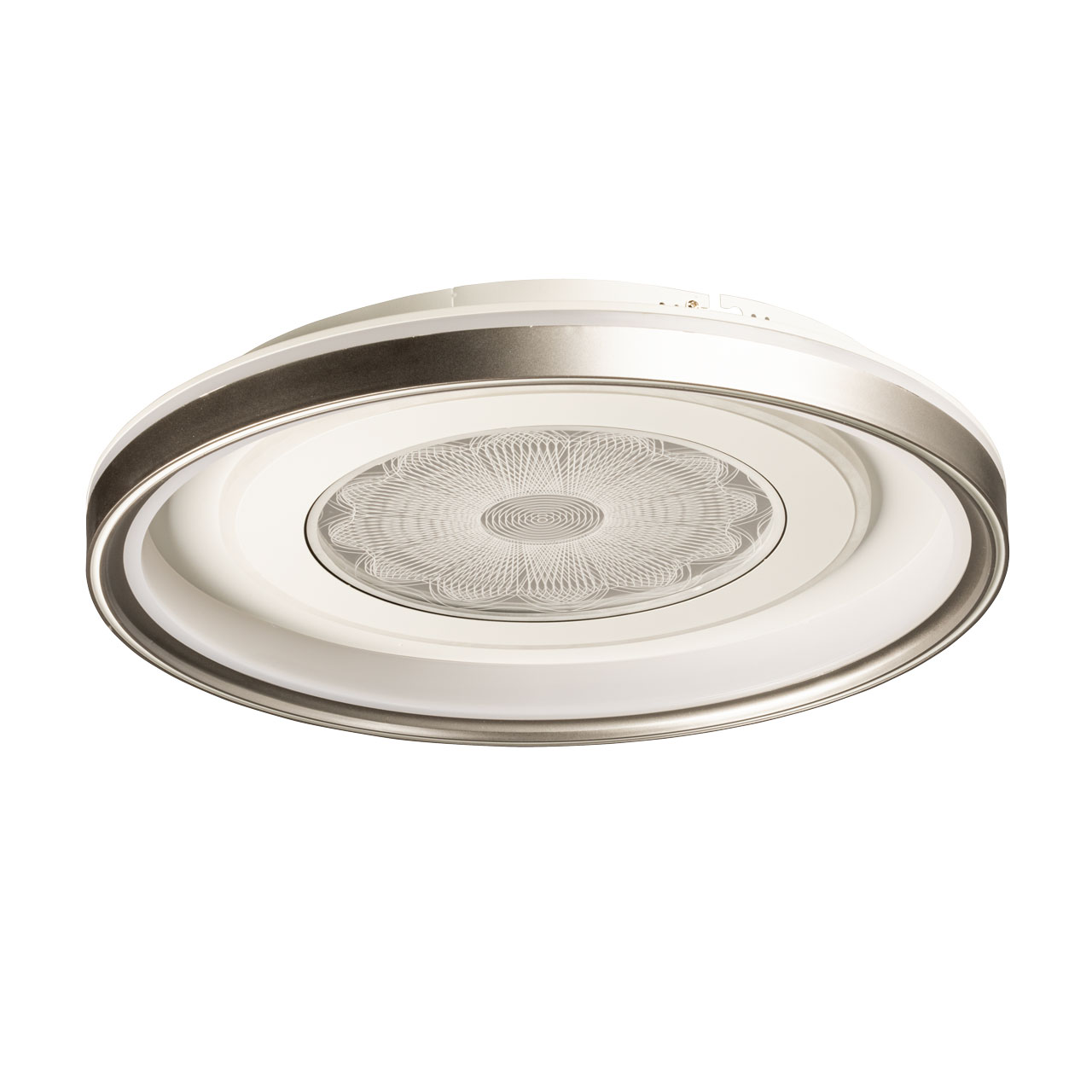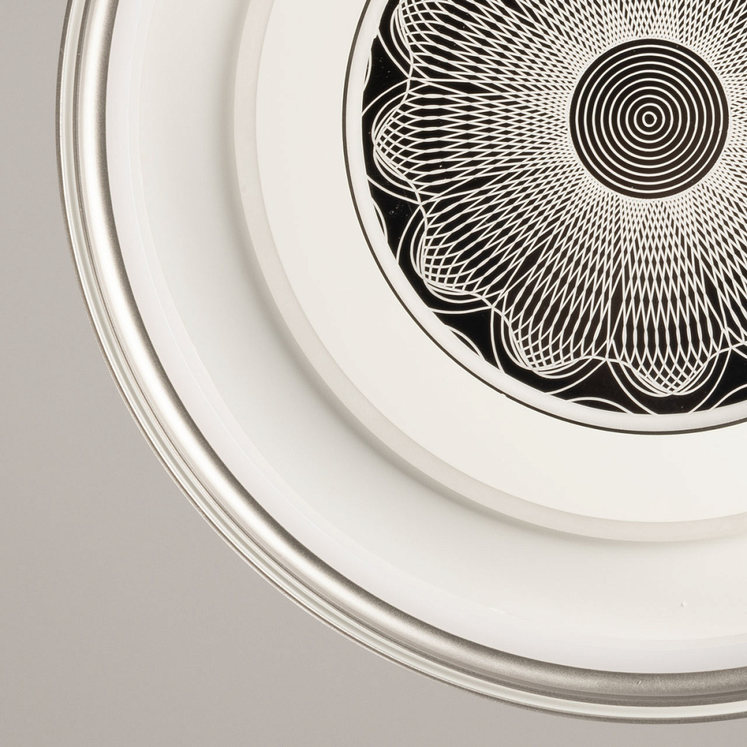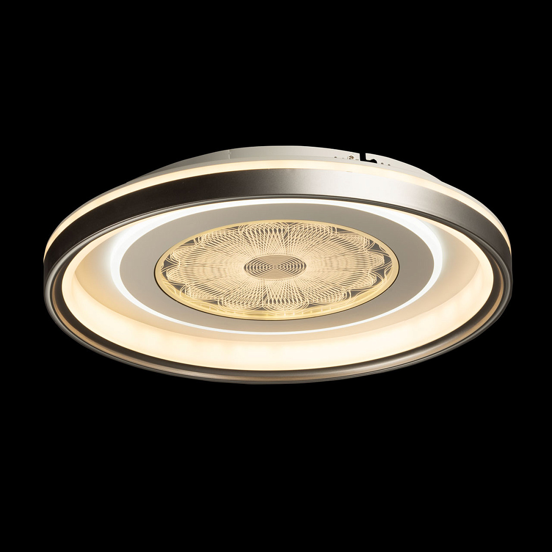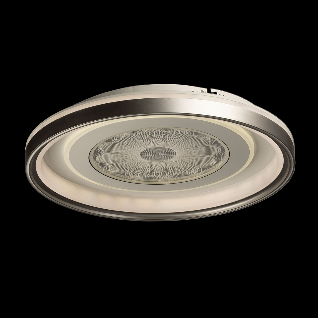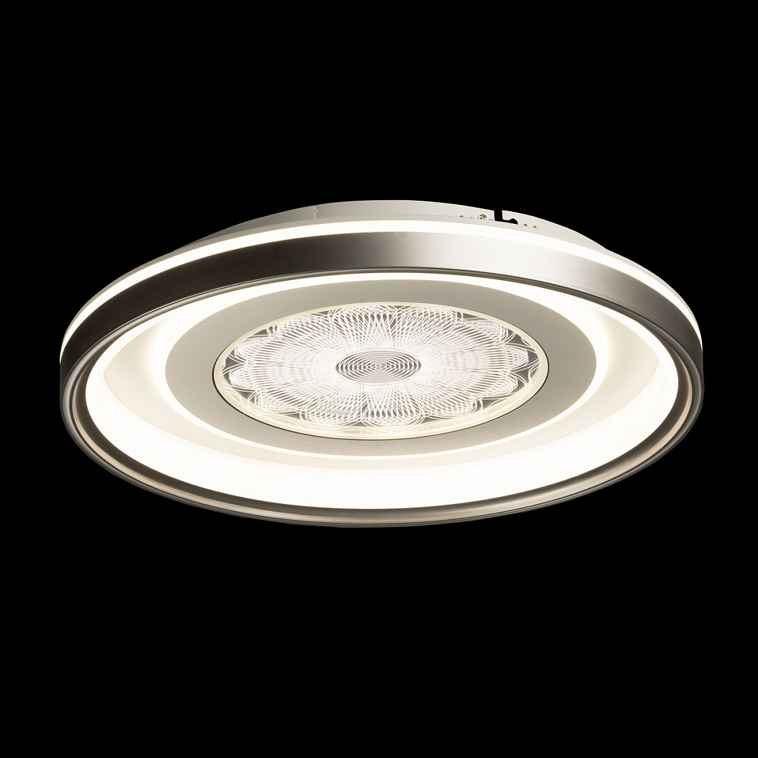 Универсальный белый цвет прекрасно подойдет к любому цветовому решению интерьера. Многорежимность с изменением цветовой температуры от 3000К до 6500К  является элементом светодизайна и позволяет подобрать комфортную температуру света. Качественные светодиоды и корпус из сплава алюминия  обеспечивают яркое освещение и долгий срок службы. Прозрачный акрил выполнен с элементами 3D-эффекта благодаря чему светильник становится арт объектом. Наличие ПДУ  обеспечивает комфортное переключение режимов освещения. Компактный светильник для стандартной высоты потолка. Светодиодные источники света экономичны и безопасны.