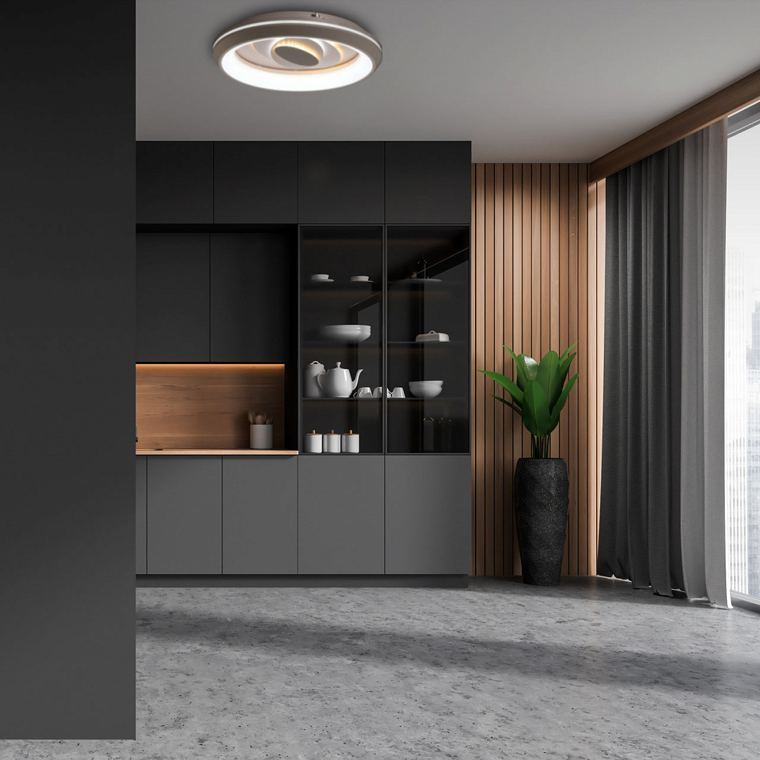 Многорежимность с изменением цветовой температуры и яркости света является элементом светодизайна. Качественные светодиоды обеспечивают яркое освещение и долгий срок службы. Наличие ПДУ позволяет управлять режимами освещения. Плавный диммер создает требуемое настроение в помещении. Геометричный декор в тренде. Компактный светильник для стандартной высоты потолка.