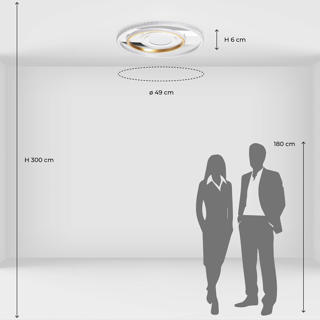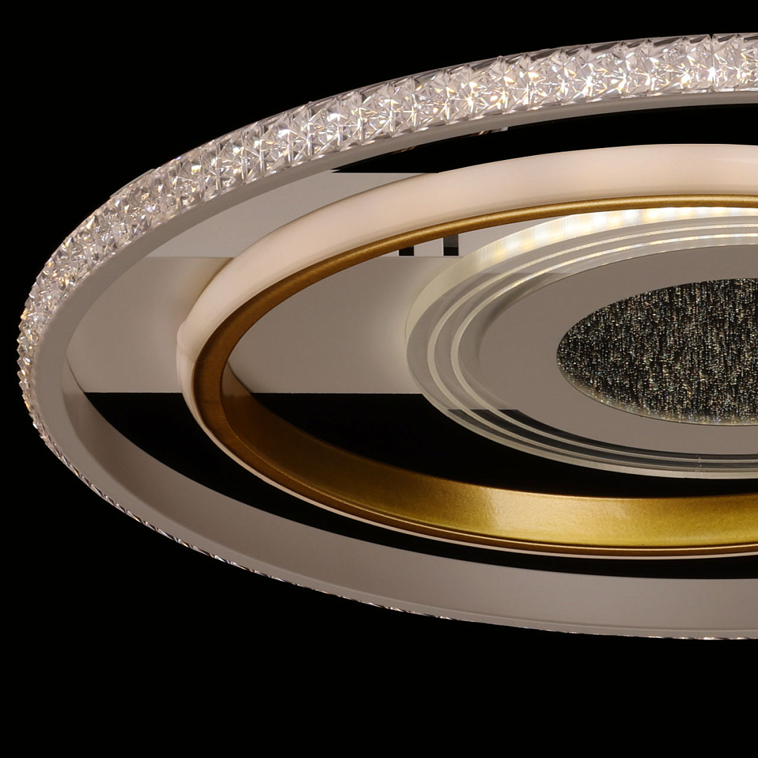 Многорежимность с изменением цветовой температуры и яркости света является элементом светодизайна. Качественные светодиоды обеспечивают яркое освещение и долгий срок службы. Наличие ПДУ позволяет управлять режимами освещения. Плавный диммер создает требуемое настроение в помещении. Модный цвет матового золота и оригинальный декор из прозрачного акрила придают потолочной люстре гламурности. Ассиметричность дизайна люстры делает акцент на индивидуальность композиции. Компактный светильник для стандартной высоты потолка.
