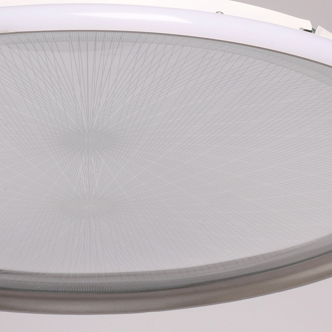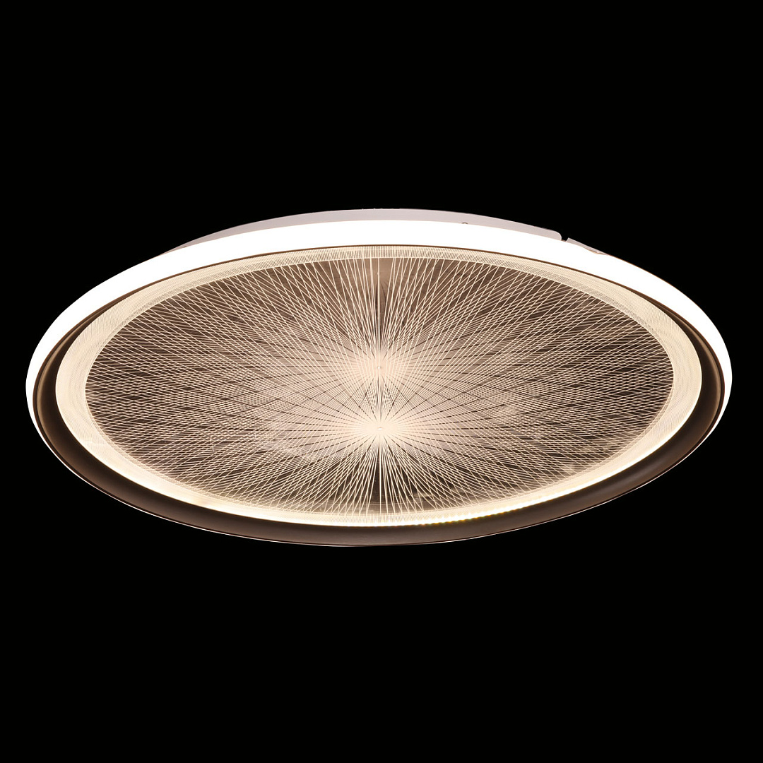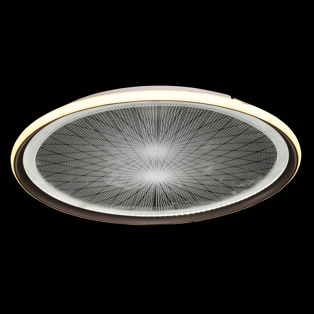 Универсальный белый цвет прекрасно подойдет к любому цветовому решению интерьера. Хромовая пластина создает дополнительный декоративный эффект. Прозрачный акрил выполнен с элементами 3D-эффекта благодаря чему светильник становится арт объектом. Многорежимность с изменением цветовой температуры от 3000К до 6500К является элементом светодизайна и позволяет подобрать комфортную температуру света. Качественные светодиоды и корпус из сплава алюминия обеспечивают яркое освещение и долгий срок службы.  Наличие ПДУ  позволяет комфортно переключать режимы освещения. Компактный светильник для стандартной высоты потолка. Светодиодные источники света экономичны и безопасны.