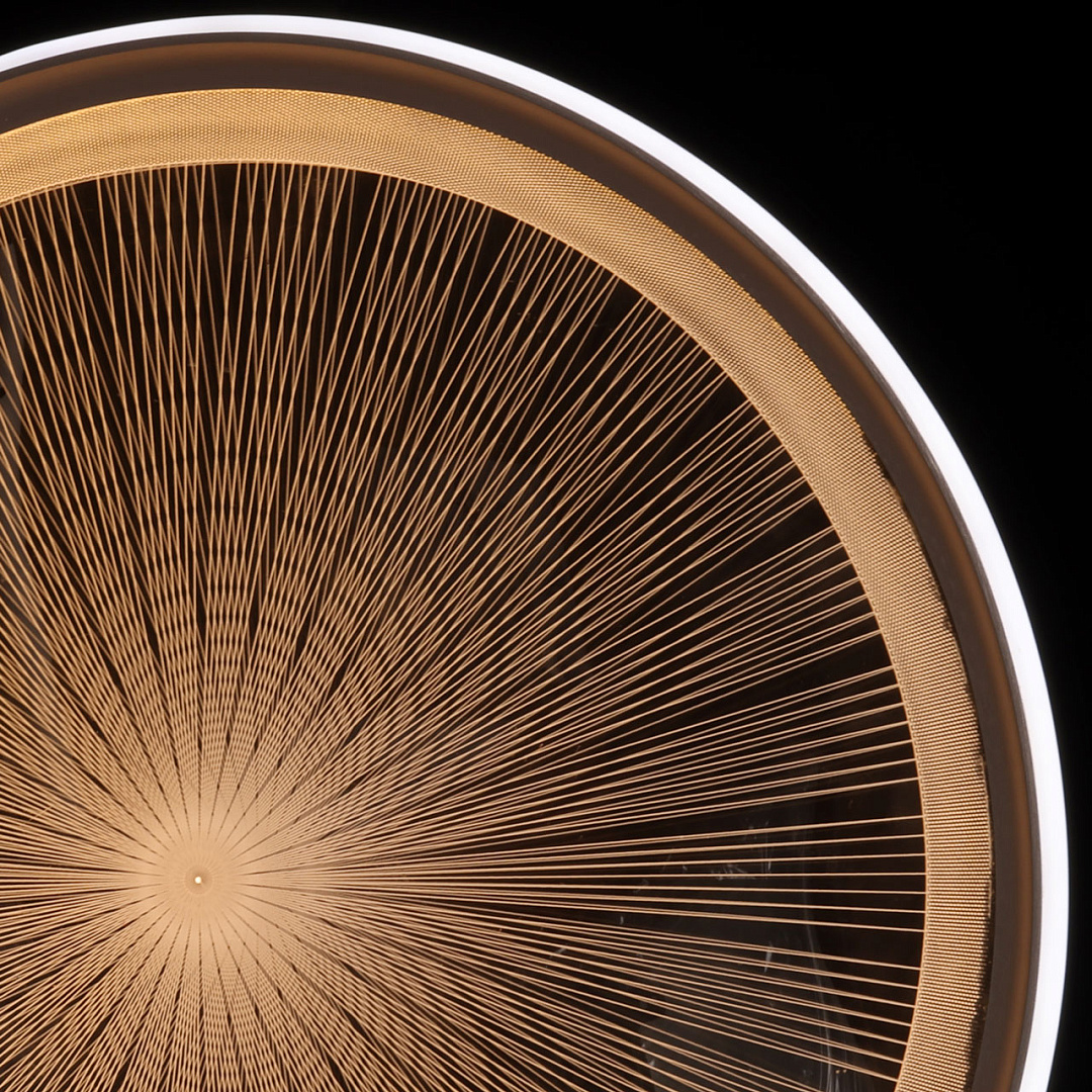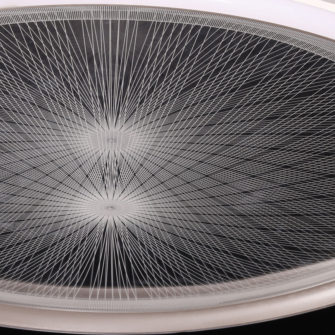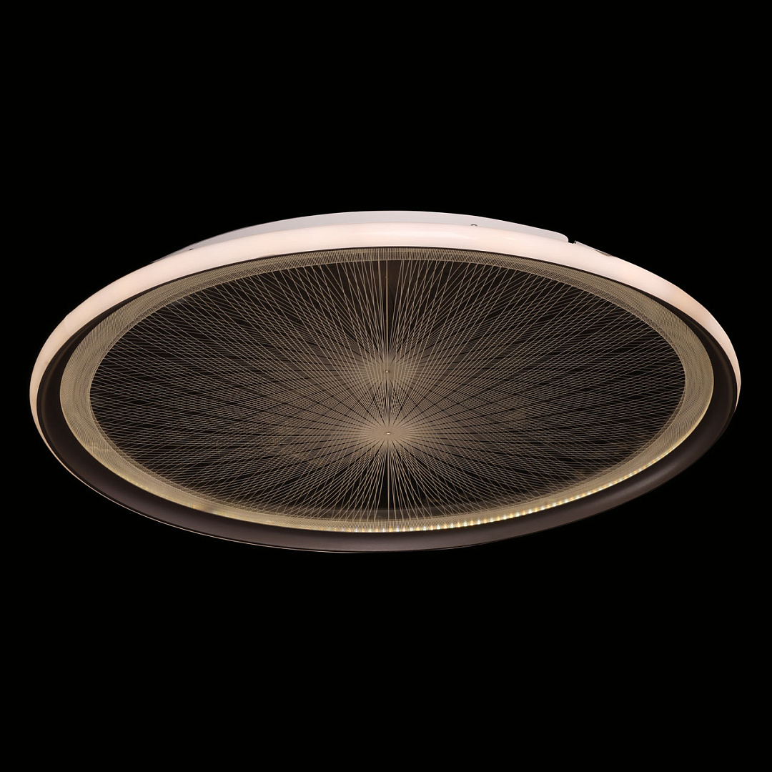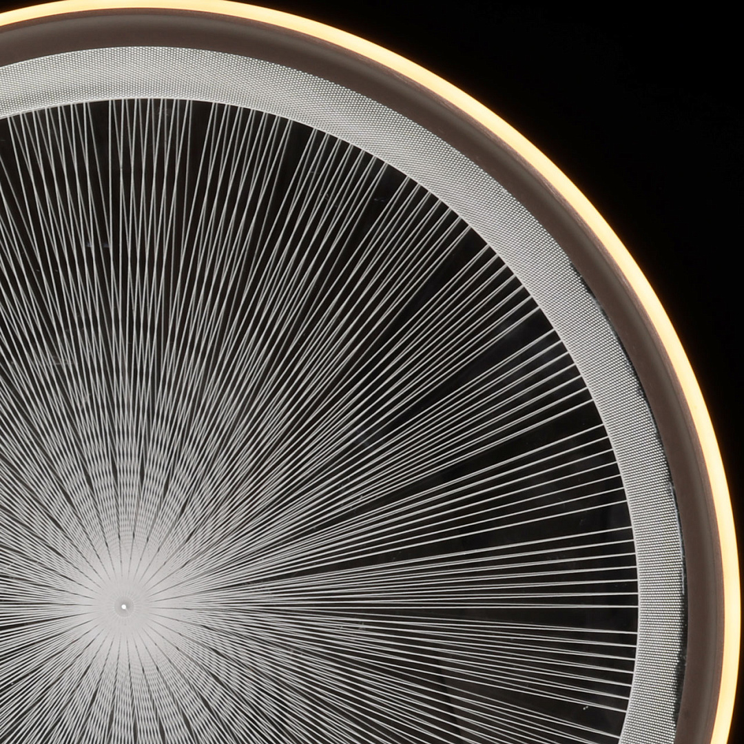Универсальный белый цвет прекрасно подойдет к любому цветовому решению интерьера. Хромовая пластина создает дополнительный декоративный эффект. Прозрачный акрил выполнен с элементами 3D-эффекта благодаря чему светильник становится арт объектом. Многорежимность с изменением цветовой температуры от 3000К до 6500К является элементом светодизайна и позволяет подобрать комфортную температуру света. Качественные светодиоды и корпус из сплава алюминия обеспечивают яркое освещение и долгий срок службы.  Наличие ПДУ  позволяет комфортно переключать режимы освещения. Компактный светильник для стандартной высоты потолка. Светодиодные источники света экономичны и безопасны.