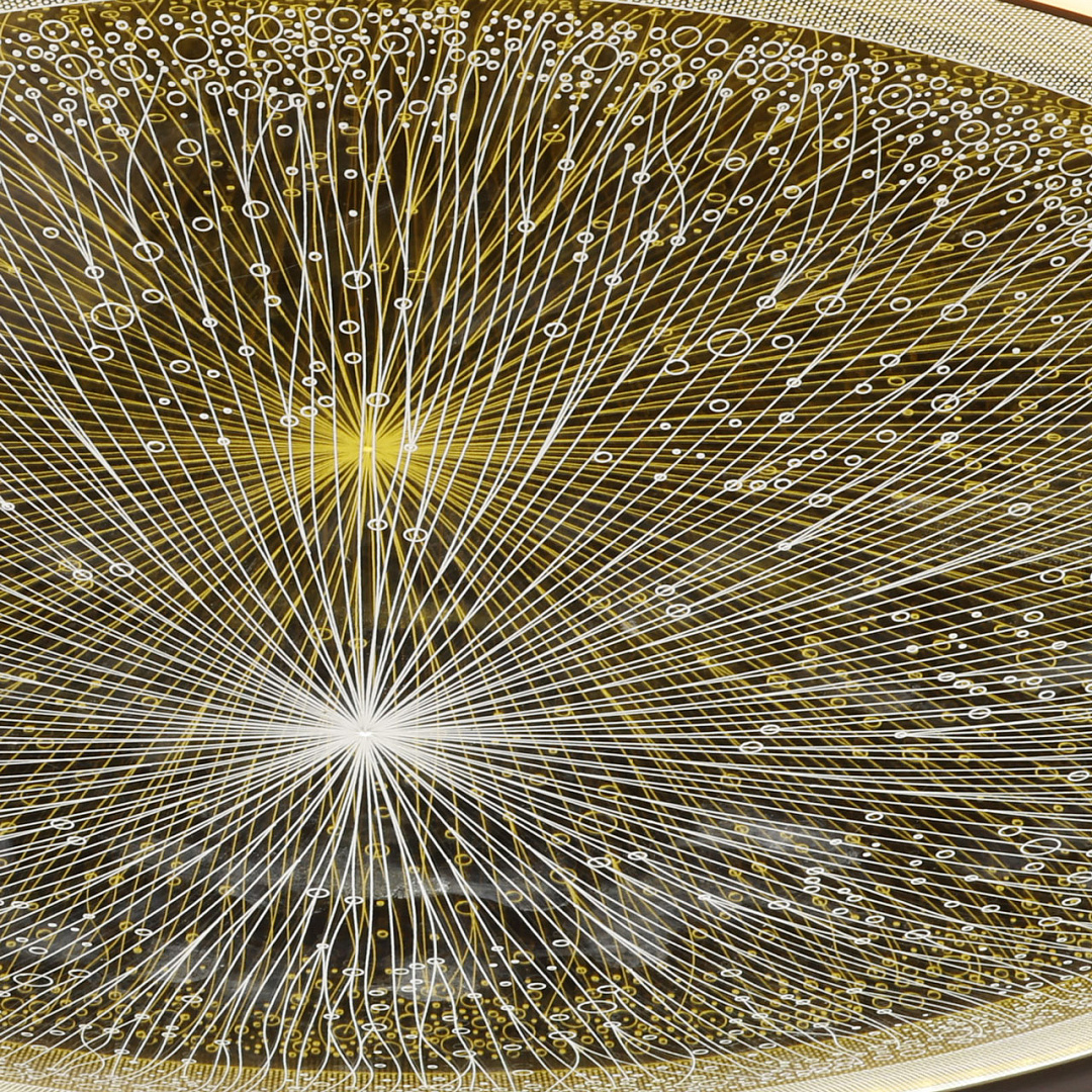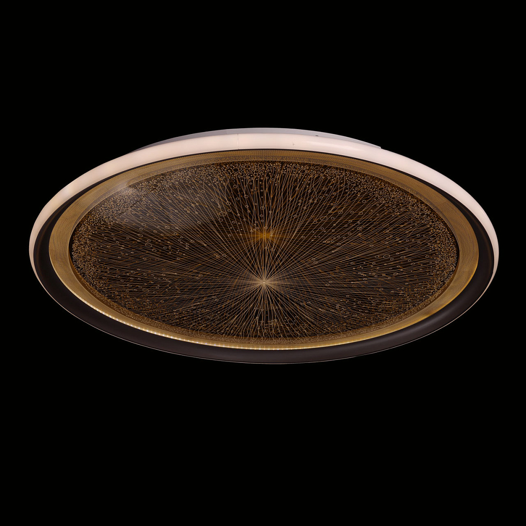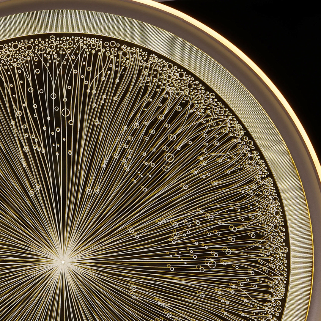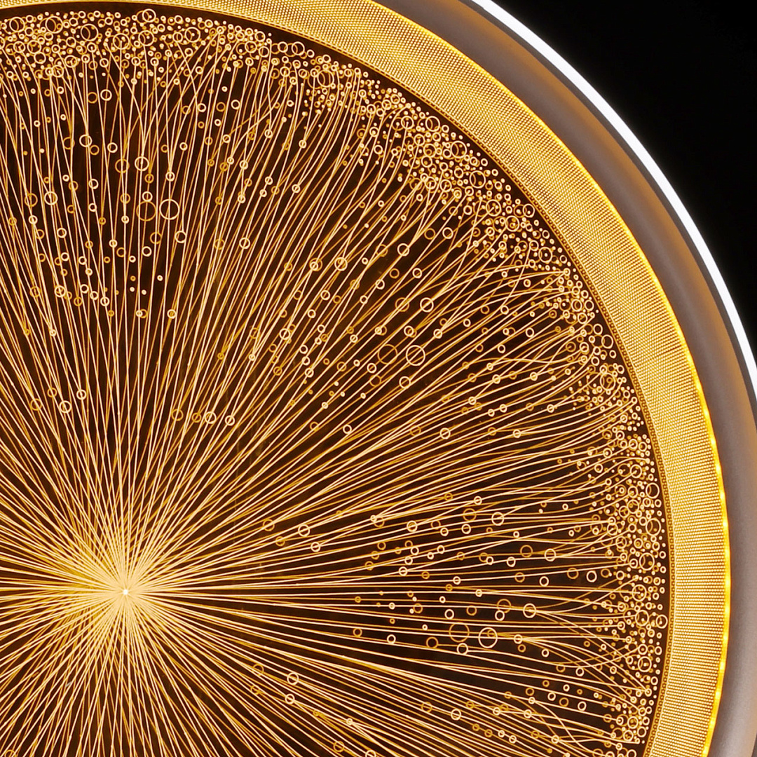 Универсальный белый цвет прекрасно подойдет к любому цветовому решению интерьера. Золотая пластина создает дополнительный декоративный эффект. Прозрачный акрил выполнен с элементами 3D-эффекта, благодаря чему светильник становится арт объектом. Многорежимность с изменением цветовой температуры от 3000К до 6500К является элементом светодизайна и позволяет подобрать комфортную температуру света. Плавное диммирование позволяет регулировать интенсивность освещения. Наличие ПДУ обеспечивает комфортное переключение режимов освещения.  Качественные светодиоды и корпус из сплава алюминия обеспечивают яркое освещение и долгий срок службы. Компактный светильник для стандартной высоты потолка. Светодиодные источники света экономичны и безопасны.