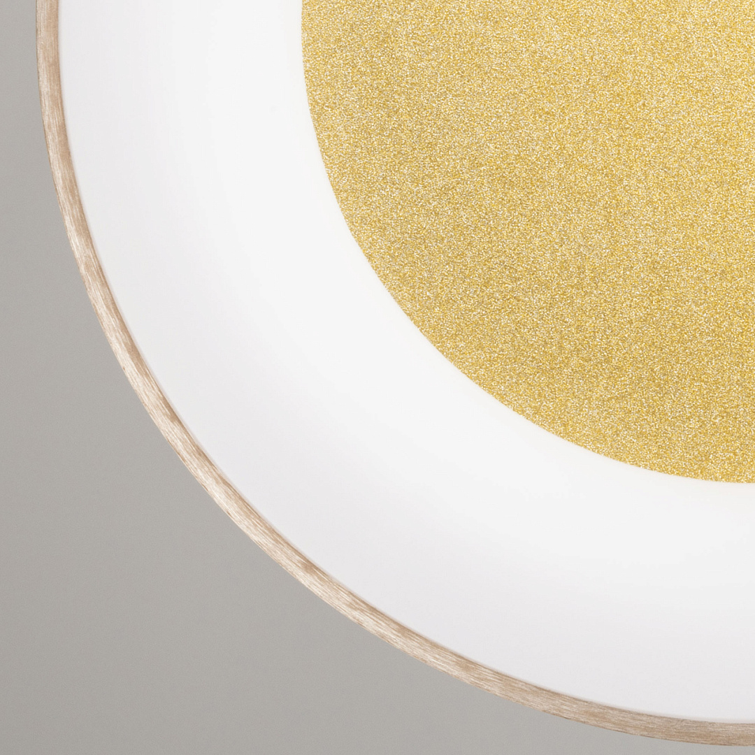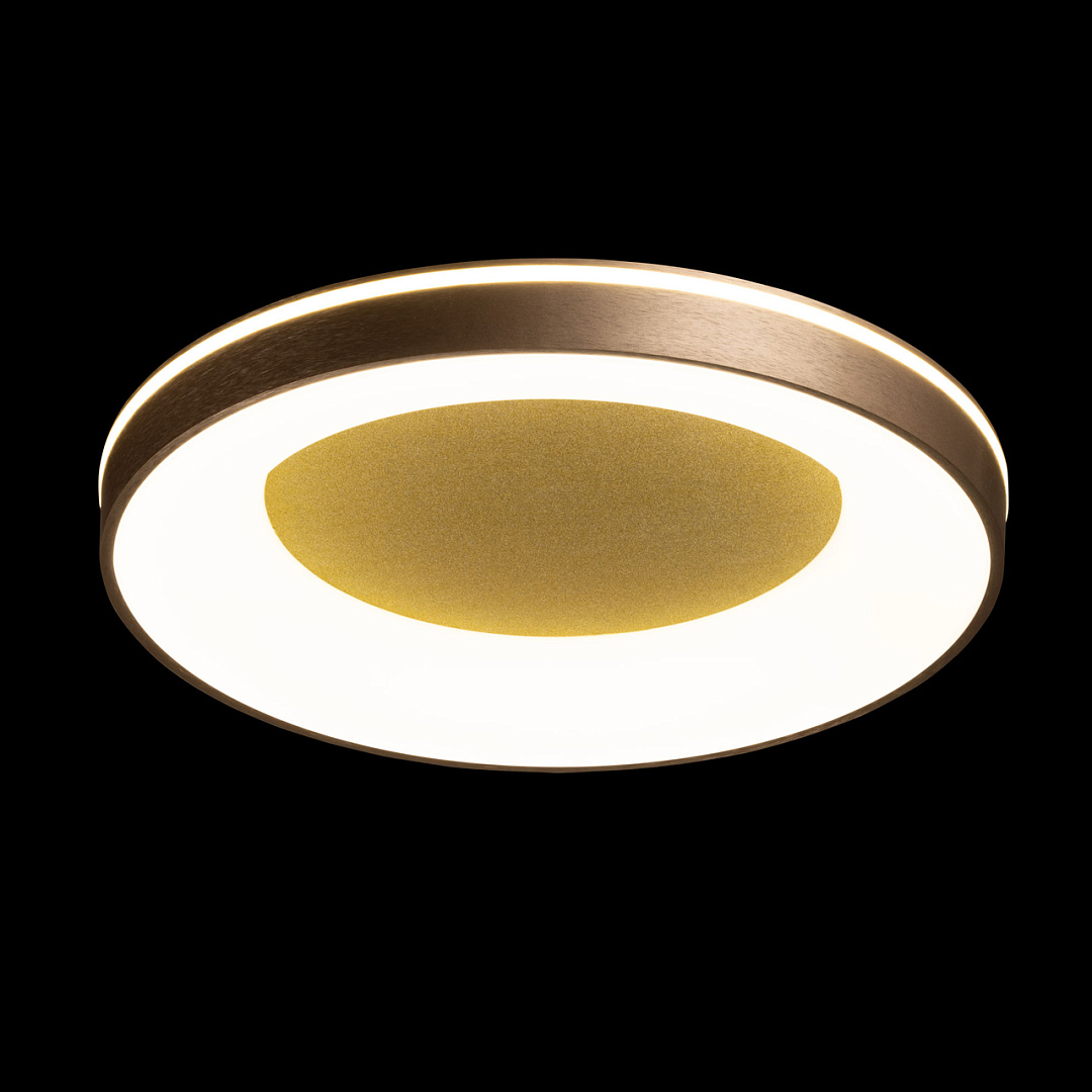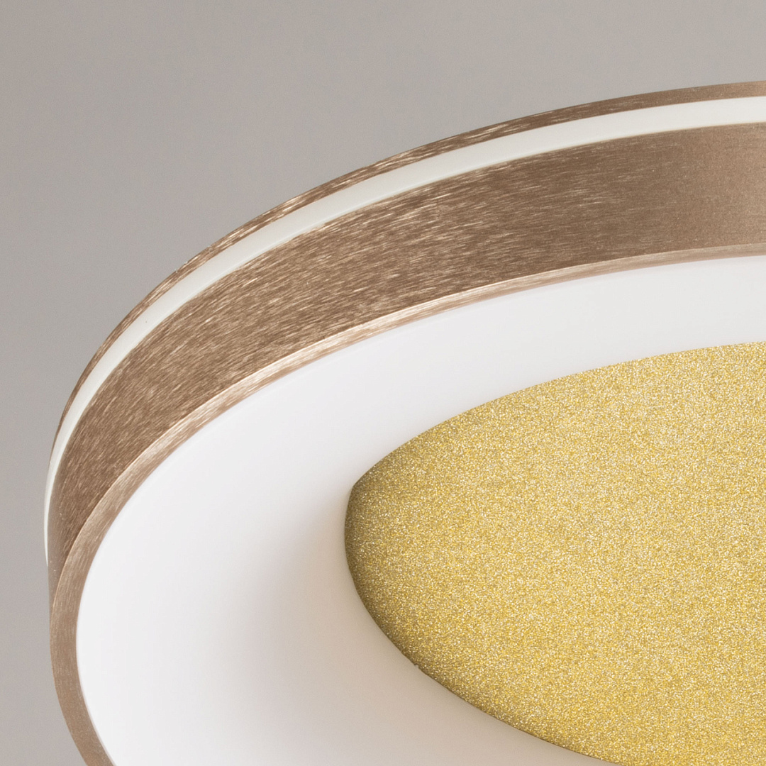 Универсальная модель светильника прекрасно подойдет к любому цветовому решению интерьера. Золотая пластина создает дополнительный декоративный эффект. Белый акрил позволяет мягко рассеивать свет. Многорежимность с изменением цветовой температуры от 3000К до 6500К является элементом светодизайна и позволяет подобрать комфортную температуру света. Качественные светодиоды и корпус из сплава алюминия обеспечивают яркое освещение и долгий срок службы. Наличие ПДУ обеспечивает комфортное переключение режимов освещения. Компактный светильник для стандартной высоты потолка. Светодиодные источники света экономичны и безопасны.