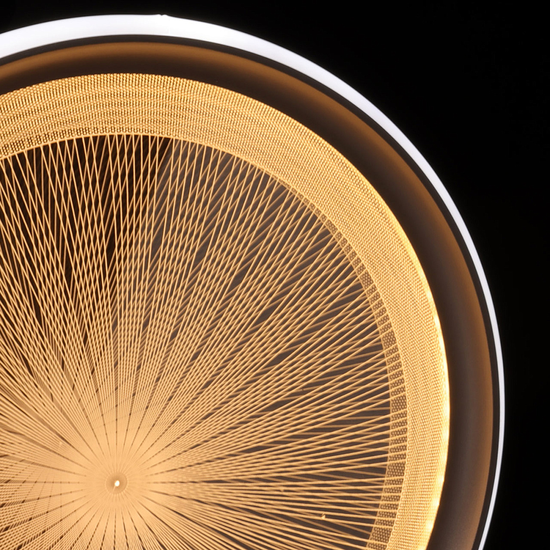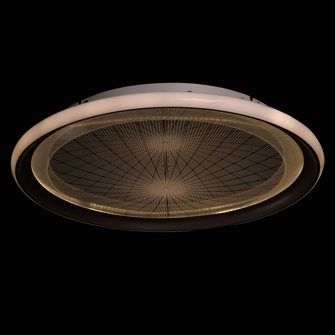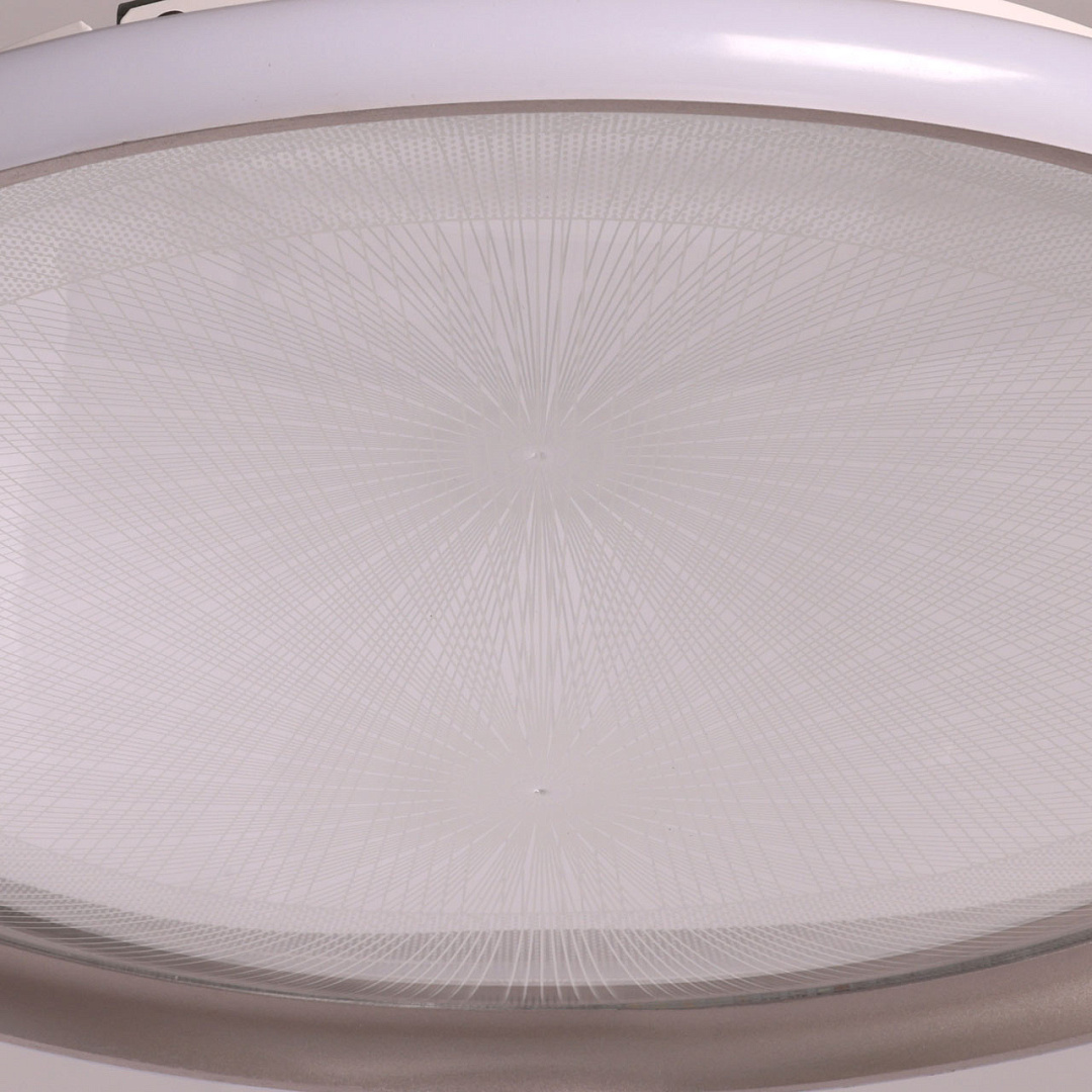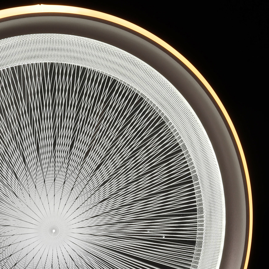 Универсальный белый цвет прекрасно подойдет к любому цветовому решению интерьера. Хромовая пластина создает дополнительный декоративный эффект. Прозрачный акрил выполнен с элементами 3D-эффекта благодаря чему светильник становится арт объектом. Многорежимность с изменением цветовой температуры от 3000К до 6500К является элементом светодизайна и позволяет подобрать комфортную температуру света. Плавное диммирование позволяет регулировать интенсивность освещения. Наличие ПДУ  позволяет комфортно переключать режимы освещения. Качественные светодиоды и корпус из сплава алюминия обеспечивают яркое освещение и долгий срок службы. Компактный светильник для стандартной высоты потолка. Светодиодные источники света экономичны и безопасны.