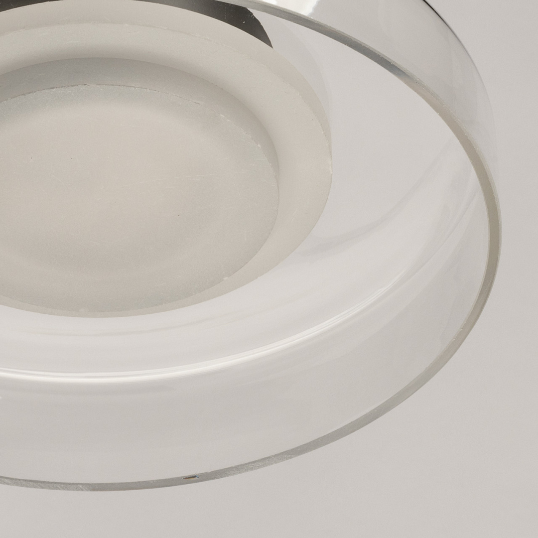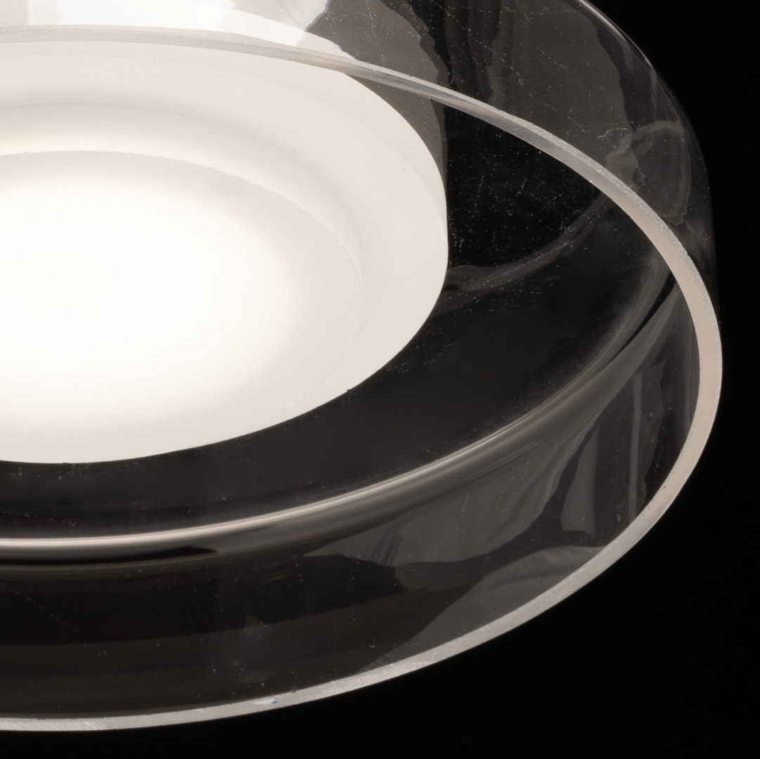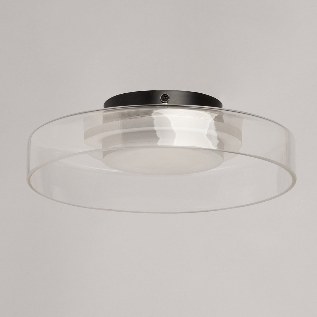 Черный цвет основания создает сдержанный и стильный образ. Стеклянный плафон придает люстре элегантности. Светодиодный источник света закрыт матовым акрилом, создавая равномерное и комфортное освещение. Качественные светодиоды экономичны и безопасны. Компактная высота светильника идеальна для стандартных потолков.