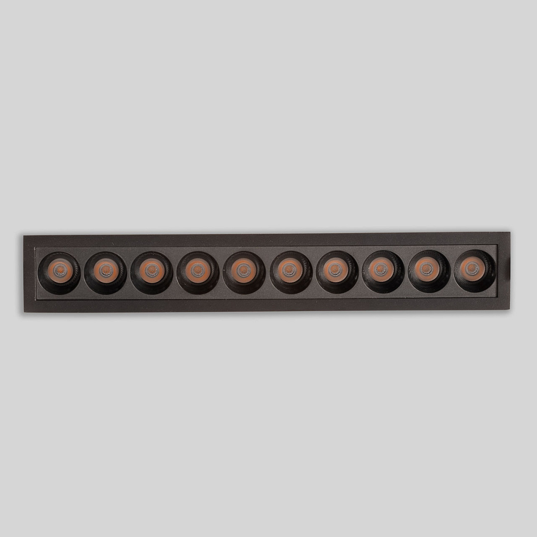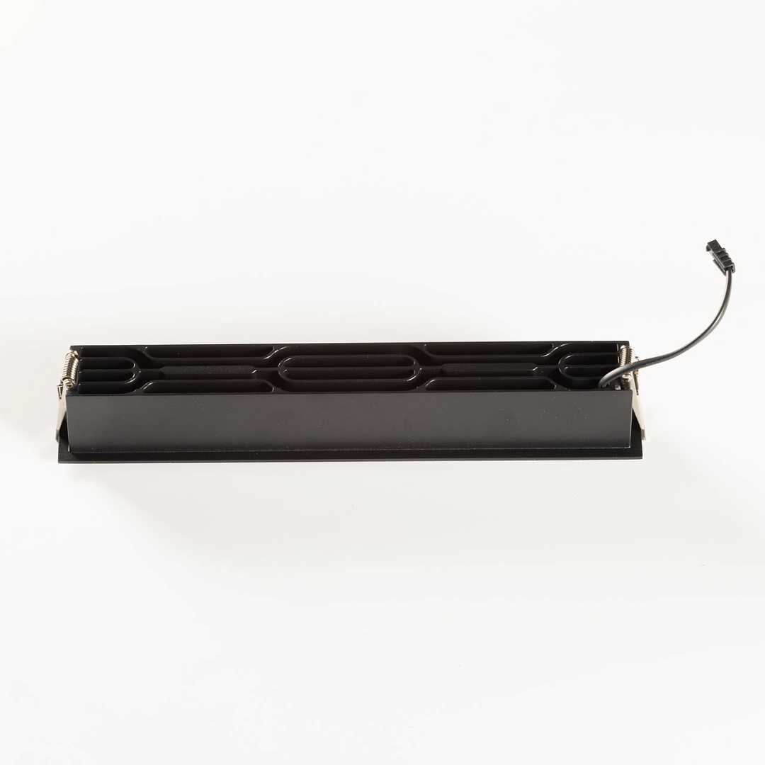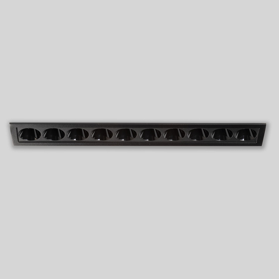 Минималистичный современный дизайн. Контрастный черный цвет делает светильник акцентом на потолке. Светодиодные источники света создают яркое освещение, а уникальная конструкция светильника с утопленными светодиодами исключает слепящий эффект. Светодиодные источники света экономичны и безопасны в эксплуатации.