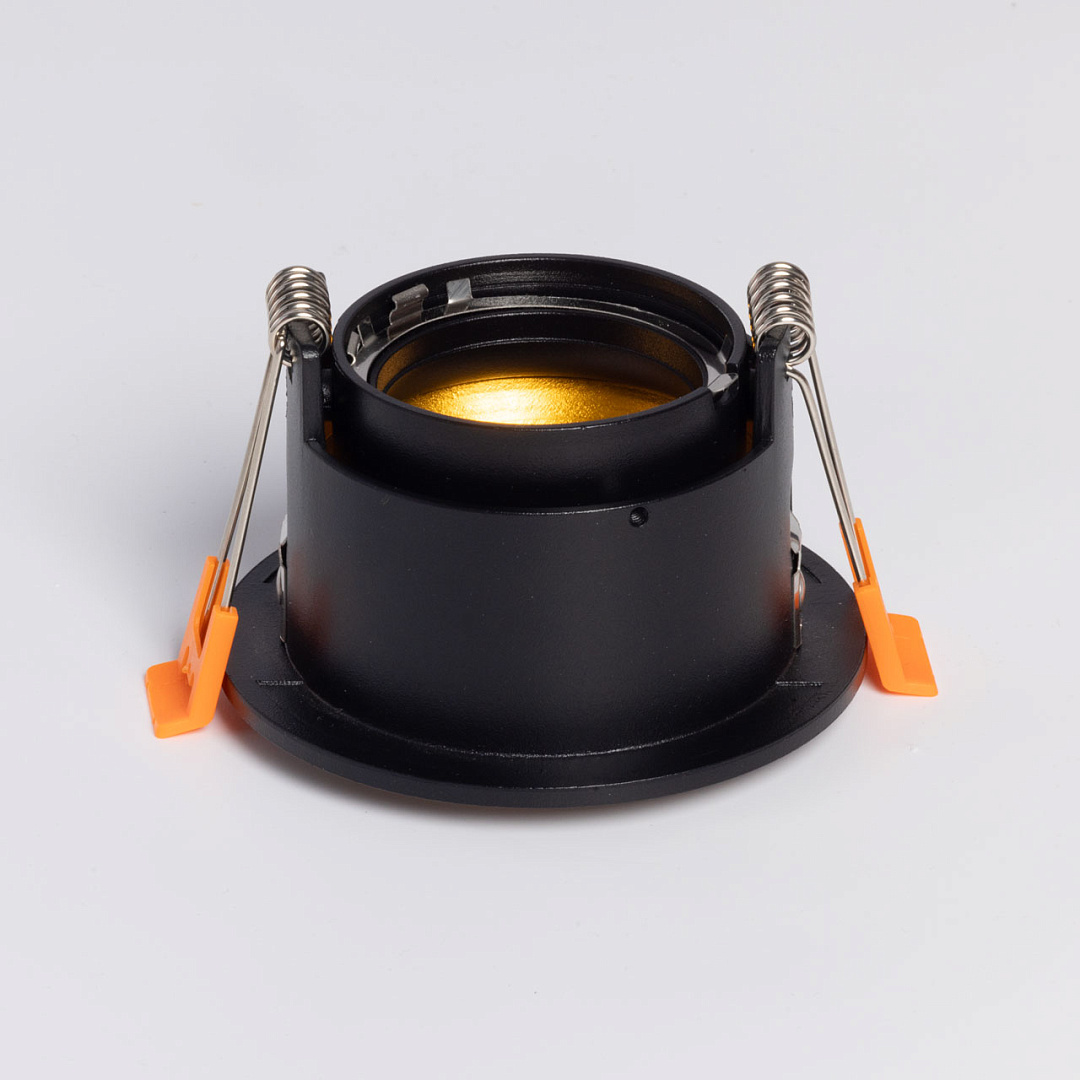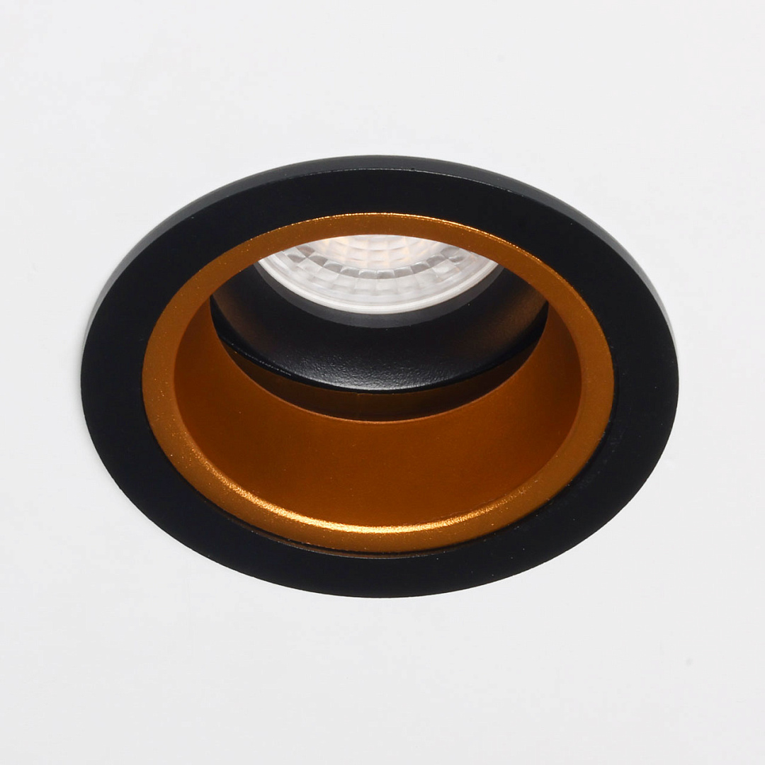 Минималистичный современный дизайн. Контрастный черный цвет делает светильник акцентом на потолке. Изысканный золотой цвет эффектно отражает световой поток. Точечное освещение пространства. Удобные держатели надежно закрепляют светильник на потолке. Заменяемый источник света удобен в эксплуатации.