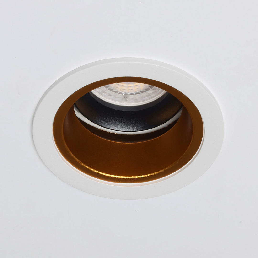 Минималистичный современный дизайн. Универсальный белый цвет гармонично вписывается в любые интерьеры. Изысканный золотой цвет эффектно отражает световой поток. Точечное освещение пространства создает акцентное освещение. Удобные держатели надежно закрепляют светильник на потолке. Заменяемый источник света удобен в эксплуатации.